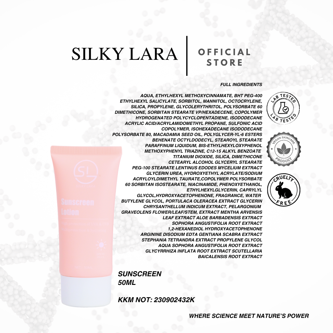 Silky Lara Sunscreen Lotion is a hybrid sunscreen which combined physical and chemical sunscreen in it. This sunscreen contains 50 SPF and PA++ (Broad-Spectrum Sunscreen) which is able to protect your skin against UVA and UVB rays. It is medium weight texture with tone up effect and minimal white cast make it very easily to blend. Besides, it is not only a regular sunscreen, you can skip your moisturizer when reapplication as it has hydrating effect.